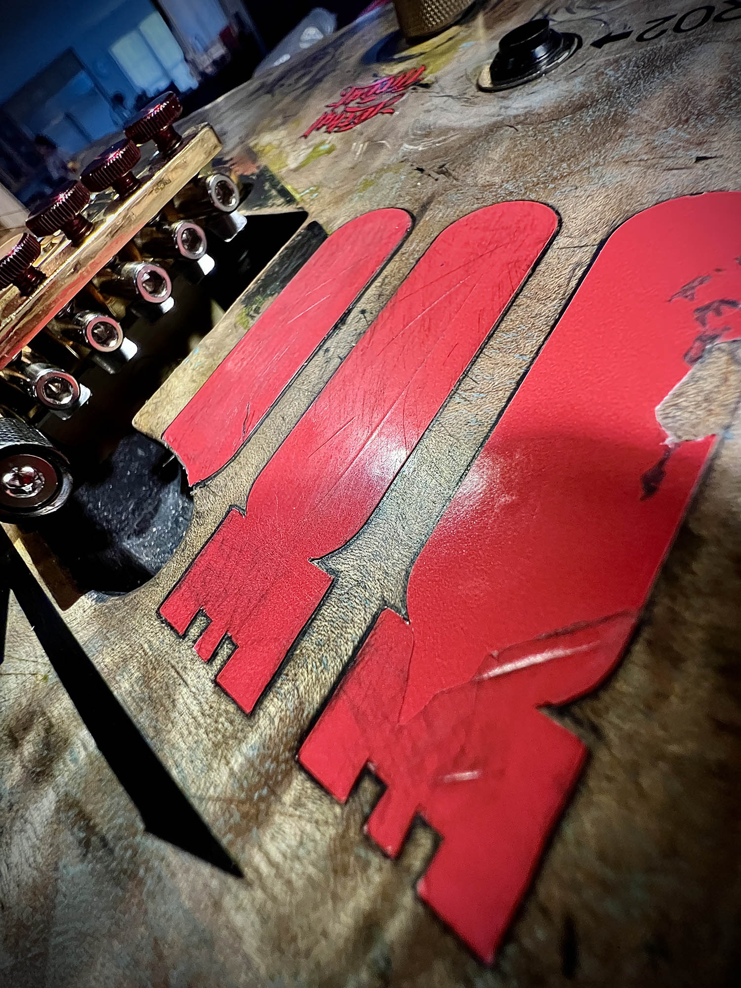 Featuring a stunning, one-of-a-kind distressed quilted maple top (likely over a solid body core), the finish looks like it survived a post-apocalyptic mosh pit: raw, weathered browns and grays with jagged cracks, ghostly sketches, and battle-worn texture that screams attitude. Hand-applied red graffiti slashes across the body—”KILL” repeated like a battle cry, bold red bars, lightning bolts, and cryptic tags—turning the guitar into a rolling manifesto of rebellion.