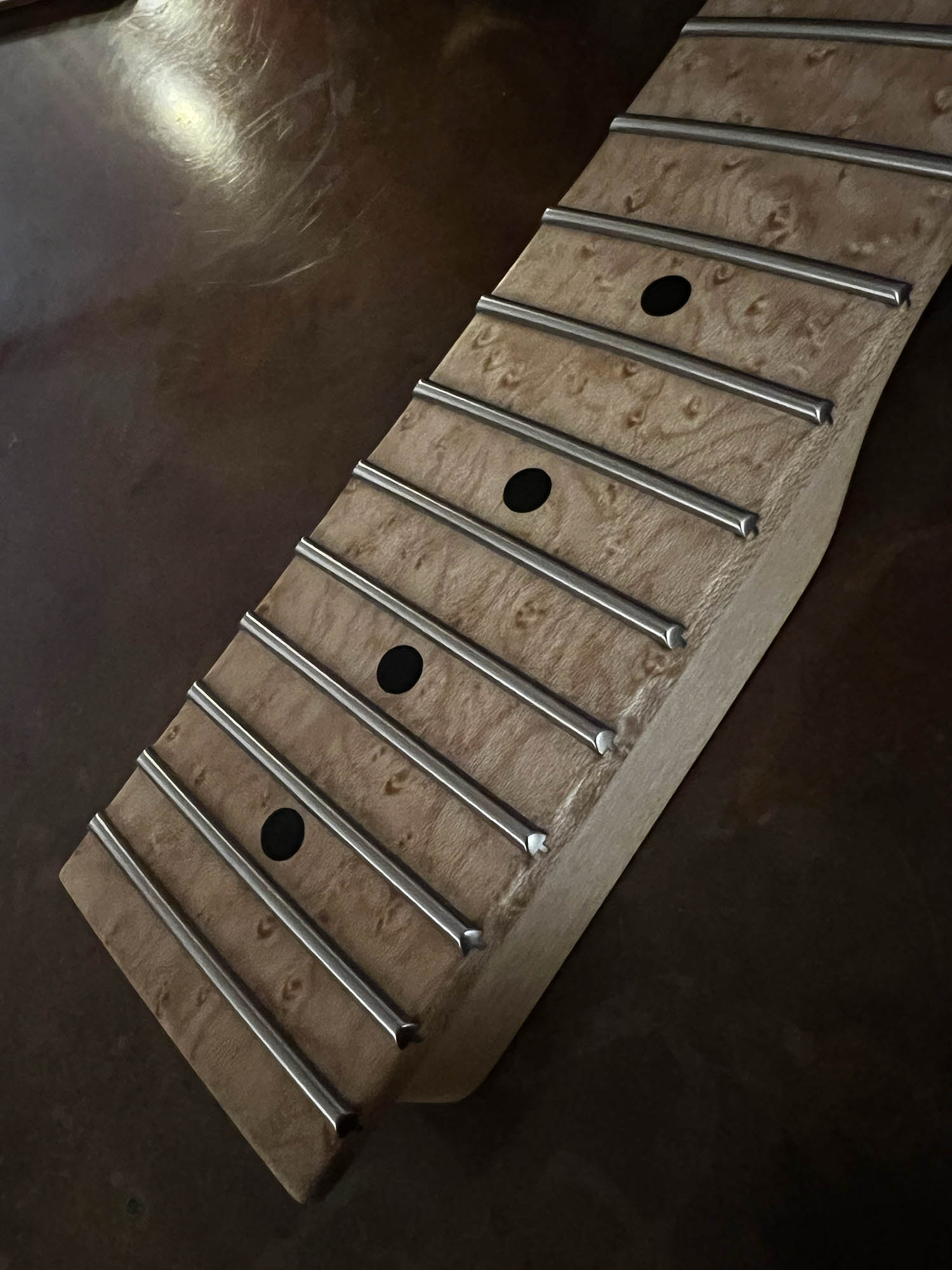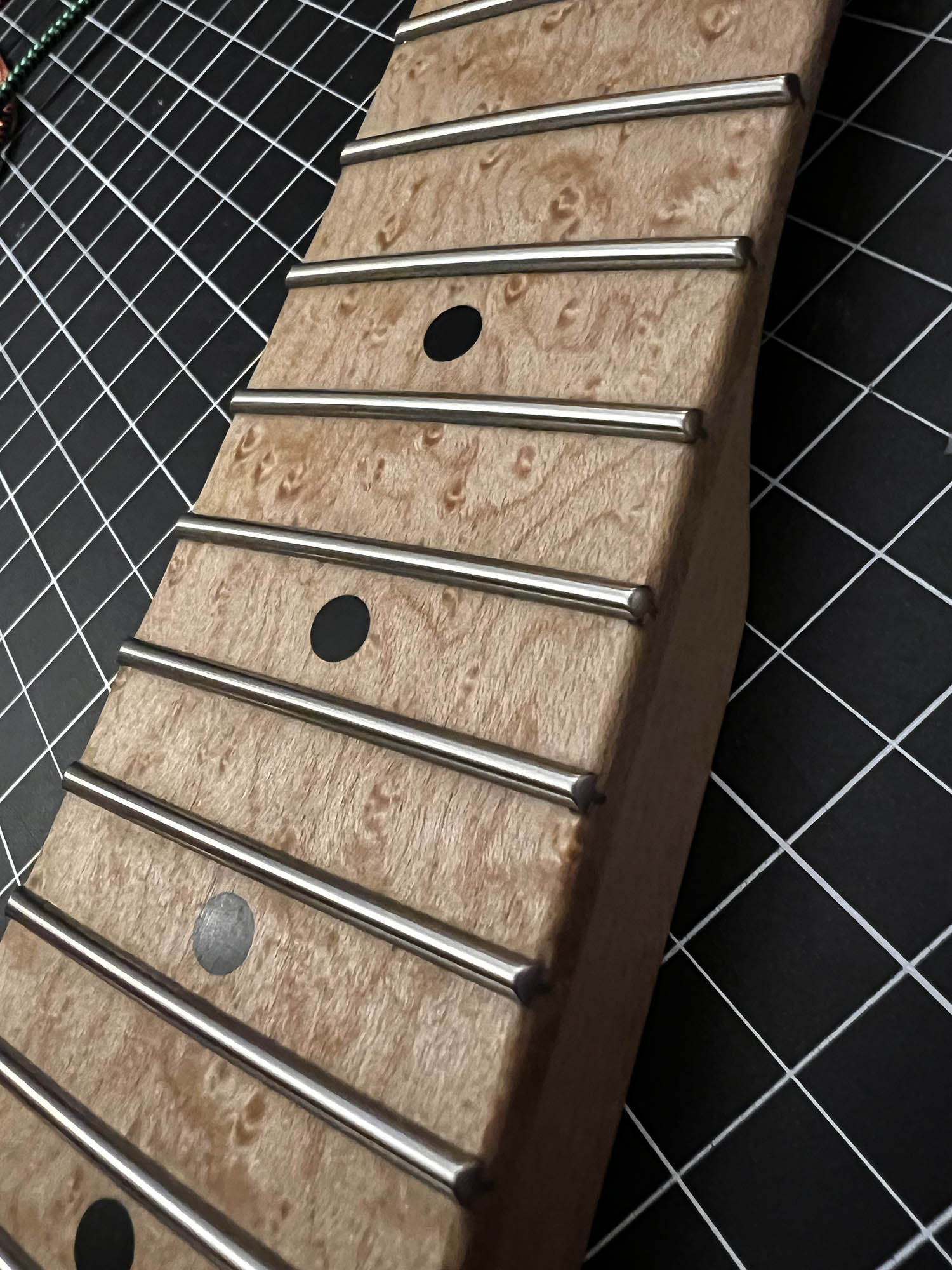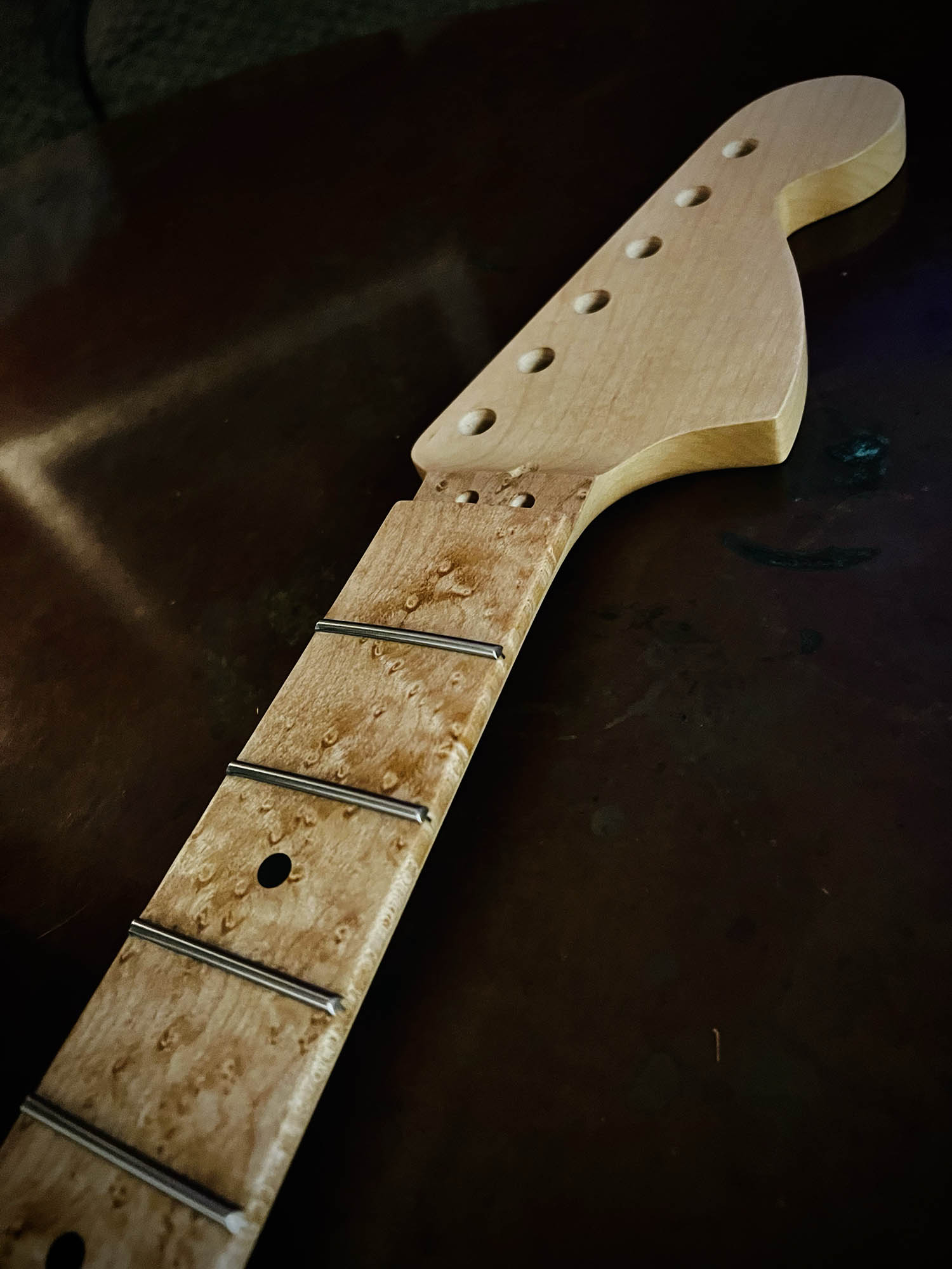 - Maple neck (likely with a fast, thin profile) topped with a birds-eye maple fingerboard, dot inlays, and super jumbo (7000) stainless-steel frets for lightning-fast playability and enduring durability
